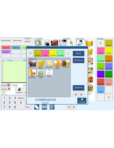 Equipo TPV con pantalla táctil, cajón portamonedas e impresora de tickets.