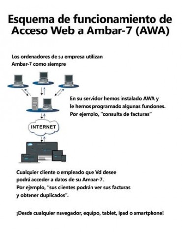 ¿Qué es AWA? AWA son las siglas de “Acceso Web a Ambar-7”. Es un módulo para su Ambar-7 al que se le pueden incorporar programas web que trabajen directamente con datos de su gestión. Es completamente seguro, y los clientes o empleados que Vd. autorice podrán utilizar los programas y utilidades de su AWA desde cualquier dispositivo con navegador web. No implica ningún cambio en su Ambar-7 actual, que seguirá trabajando como hasta ahora, en el mismo servidor. Por tanto, podrá acceder a datos contenidos en su Ambar-7, desde cualquier navegador web, ya sea en su Smartphone, iPad o tableta, portátil o equipo de sobremesa. ¿Qué utilidad tiene? AWA abre la puerta a nuevas posibilidades de explotación y uso de su Ambar-7, accediendo directamente a los datos desde cualquier lugar donde se disponga de un navegador web (iPad, portátil, Smartphone…). Le permite desarrollar módulos que permitan por ejemplo: